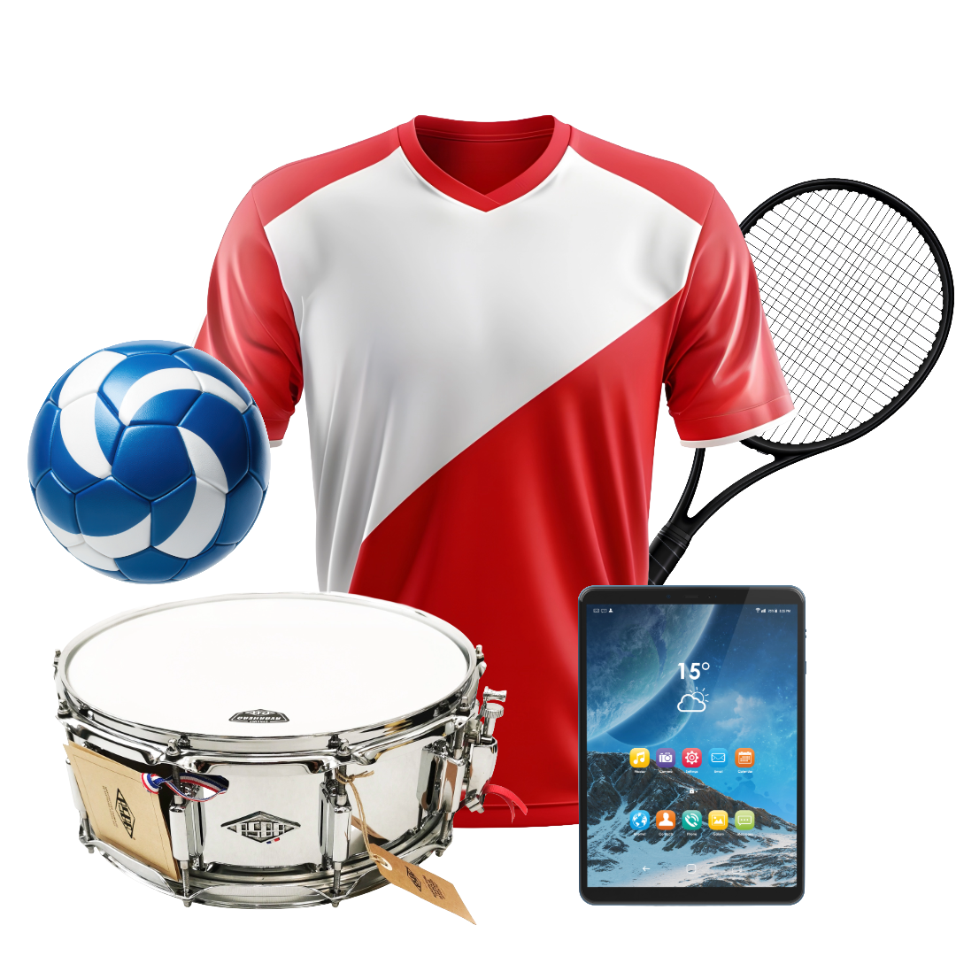 Das dargestellte Bild (Handball, Trommel, Trikot, Tennis, Tablet), stellt lediglich ein Symbolfoto dar.